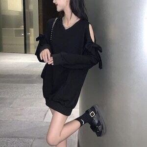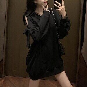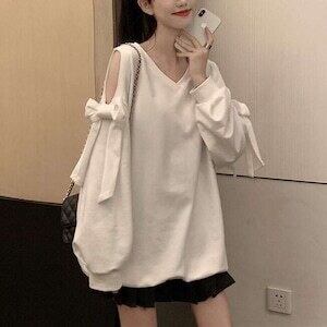 リボンモチーフトレーナー 肩出し ロンT オーバーサイズ風 ガーリー カジュアル E209
