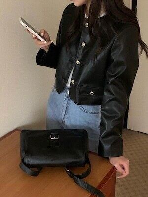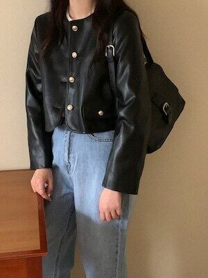 フェイクレザー風ジャケット ノーカラー ショート丈 エレガント E579
