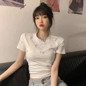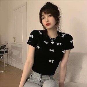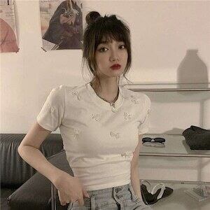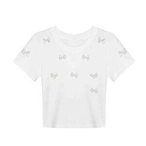 パールTシャツ リボンモチーフT ガーリー フェミニン E419