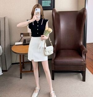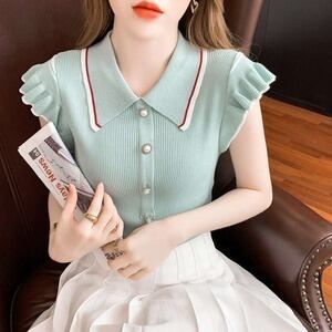 サマーニットトップス ポロシャツ ガーリー フリル E266