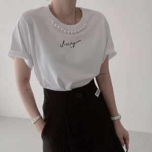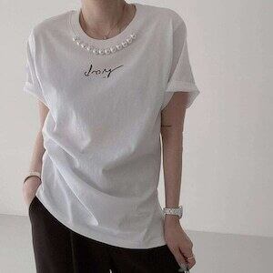 パールモチーフTシャツ ロゴTシャツ 半袖 春 夏 エレガント ママコーデ E244