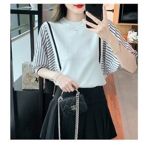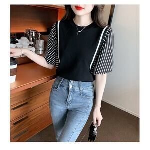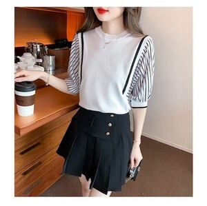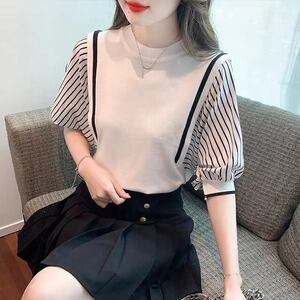 デザイントップス ストライプ 半袖 ブラウス オフィスカジュアル エレガント E205