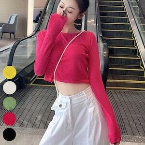 サマーニット トップス 長袖 へそ出し トップス 夏 無地 D410