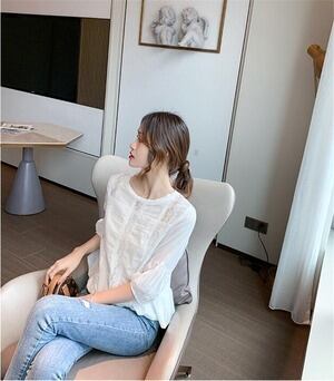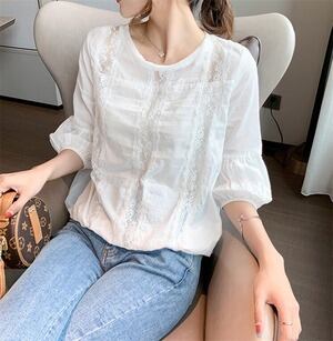 おしゃれ レース ラウンドネック シフォンブラウス D1949