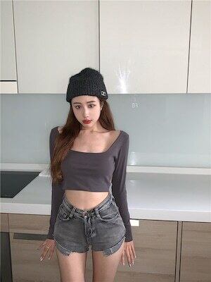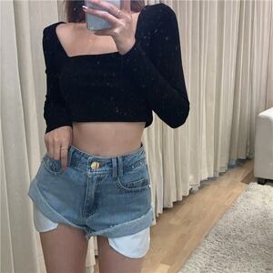 韓国ファッション スクエアネック オシャレ 長袖 Tシャツ D1922