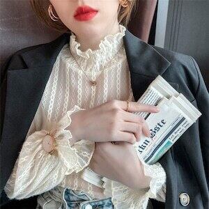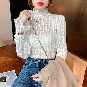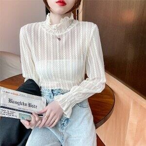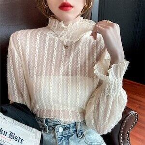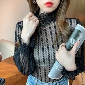 シアートップス 春 夏 長袖 レース シャツ 女性 セクシー レーヨン トップス D1904