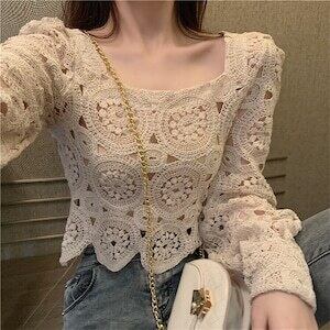 韓国ファッション 秋 スクエアネック 短いスタイル オシャレ レーストップス D1900