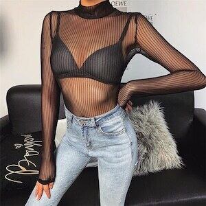 シアートップス 韓国ファッション セクシー レース 長袖 スリム D1879