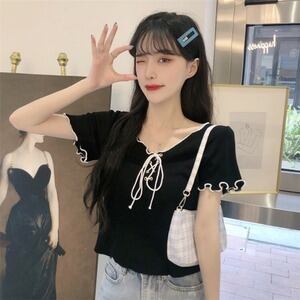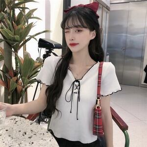 Vネック 短いスタイル sweet系 ゆったり レーストップス D1853