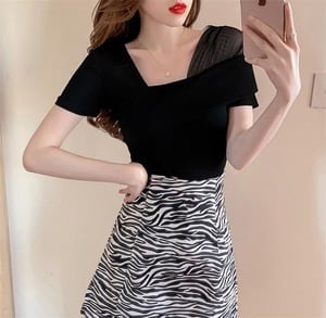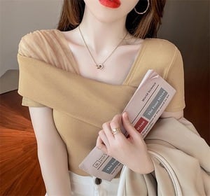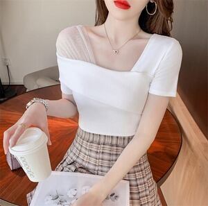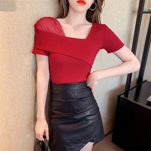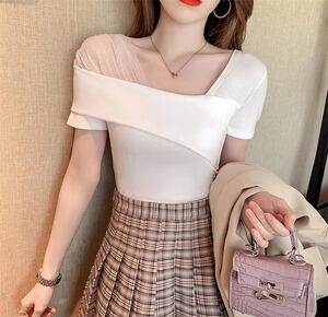INSスタイル ウエスト短いスタイル Tシャツ スリム スラントショルダー 鎖骨 タイト トップス 半袖 D1850