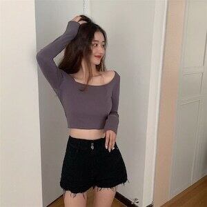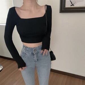 韓国ファッション スクエアネック 長袖 スリムフィット トップス ボトムシャツ Tシャツ D1849