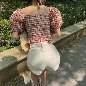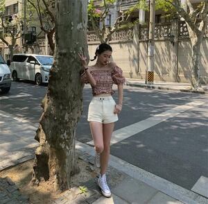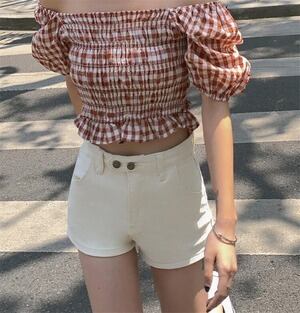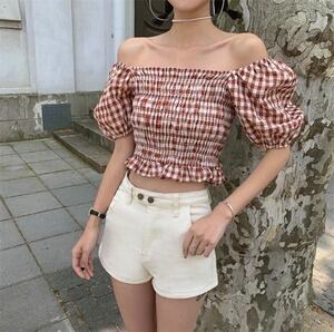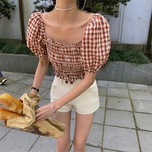 INSスタイル レトロ チェック柄 ハイウエスト 半袖 トップス セクシー D1838