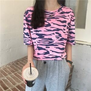 韓国ファッション 夏 ゆったり 短いスタイル ゼブラ柄 半袖 Tシャツ カジュアル D1813