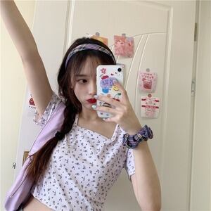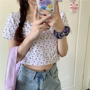 INSスタイル sweet系 スクエアネック 半袖 花柄 Tシャツ スリムフィット D1812