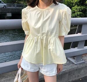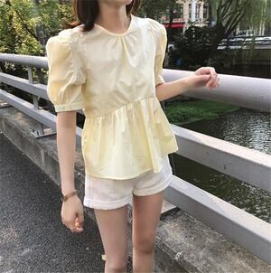 ラウンドネック フレンチスタイル レトロ パフスリーブ D1761