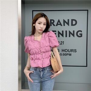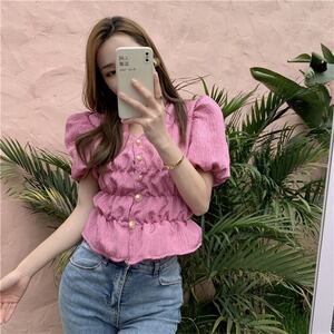 プリーツ パフスリーブ Vネック 単体ボタン トップス D1756