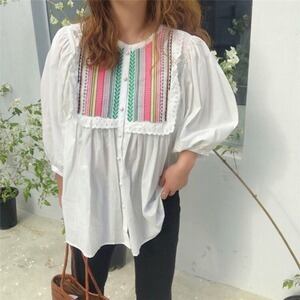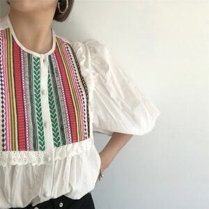 ラウンドネック パフスリーブ トップス sweet系 カジュアル レトロ シャツ D1742