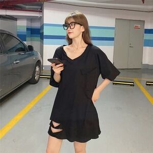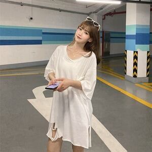 半袖 Vネック ポケット トップス ロングTシャツ D1731