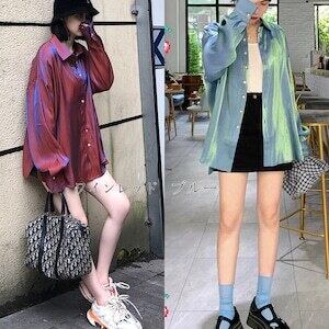 ブラウス サテン ロングシャツ 光沢 トップス 長袖 カーディガン レディース D343