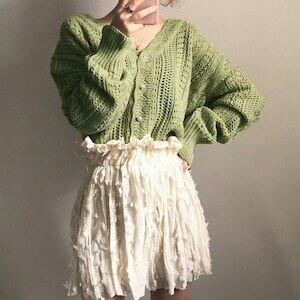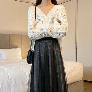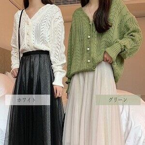 可愛い透かし編みVネック長袖レースニットカーディガンです。
