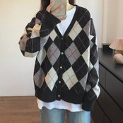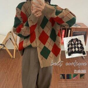 女性らしい綺麗なシルエットを演出してくれるアーガイル柄カーディガン。