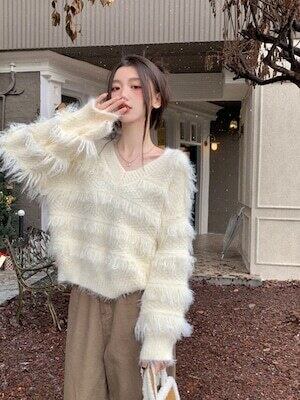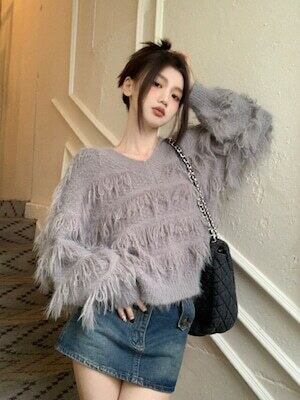 フリンジニット Vネックセーター カジュアル ガーリー E526