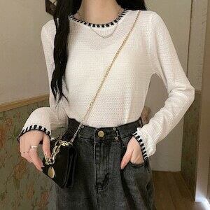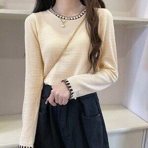 フェミニンな雰囲気たっぷり、バイカラーヘム切り替えデザインのニットトップス
