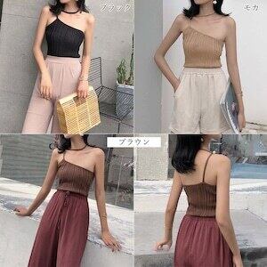 今年大流行のワンショルダーとホルターネックデザイン、シンプルながらもしっかりトレンドを取り入れる旬顔アイテム