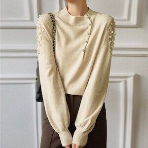 袖口と裾のリブで可愛いシルエットを引き締める、肩部分に肌魅せの透け感がとてもフェミニンで大人女性セクシーな雰囲気に