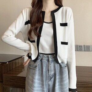大胆なモノトーン配色が目を引く大人コーデにおすすめの2点セットのニットアンサンブル