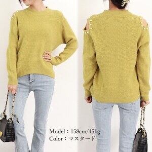 パールをあしらった肩開きデザインである肌見せに大人可愛い長袖ニットトップスです